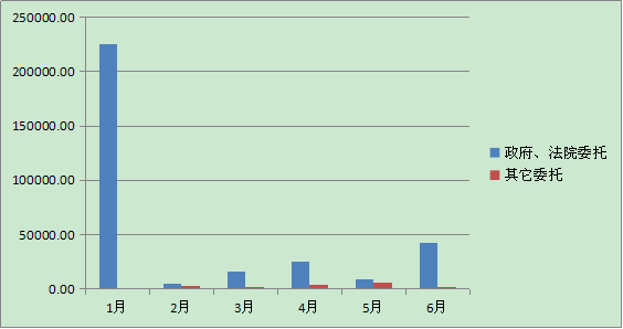2月、4月、5月政府、法院委托成交額仍然是主要來源,其余月份其他社會委托出現(xiàn)大幅增長。