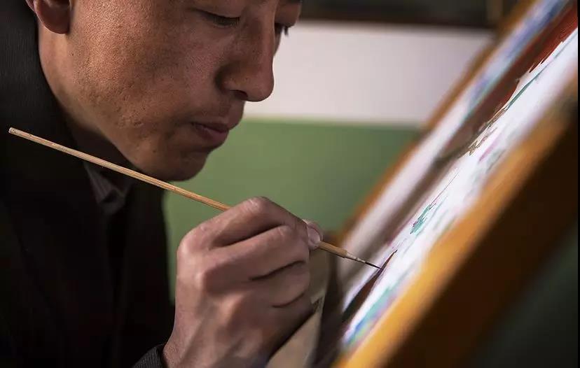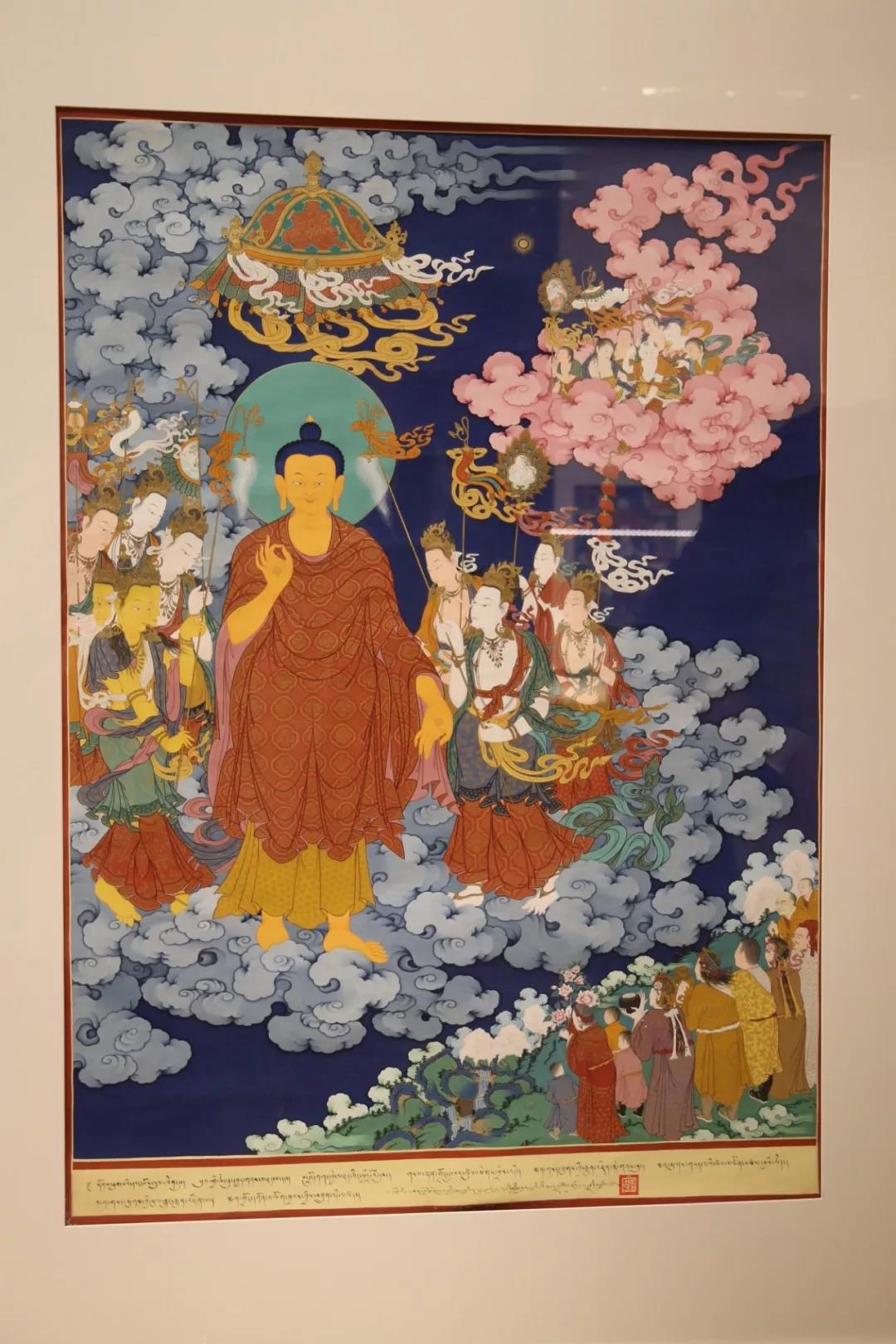據了解,《佛祖天降》是一幅100cm×80cm的唐卡,是貢覺杰近期創(chuàng)作的唐卡作品,曾斬獲過“金菊獎”金獎等多種獎項。電話聯(lián)系貢覺杰時他說,《佛祖天降》是傳統(tǒng)題材,包括上色、勾線、技藝渲染等方面,都是按照勉薩派唐卡的傳統(tǒng)技法,只是在白描設計時,根據自己對于唐卡創(chuàng)作的理解和感受,加入了一些新的靈感,人物形象、背景與人物的空間之間也有了部分創(chuàng)新。